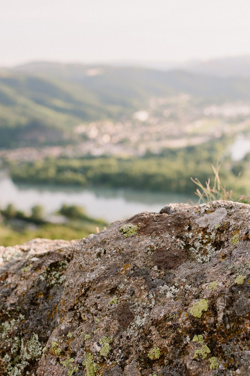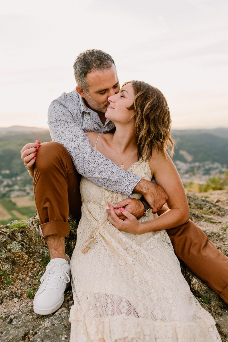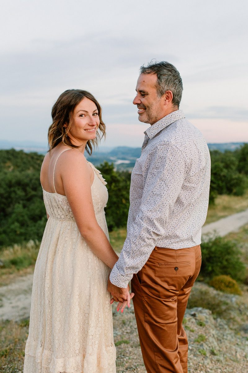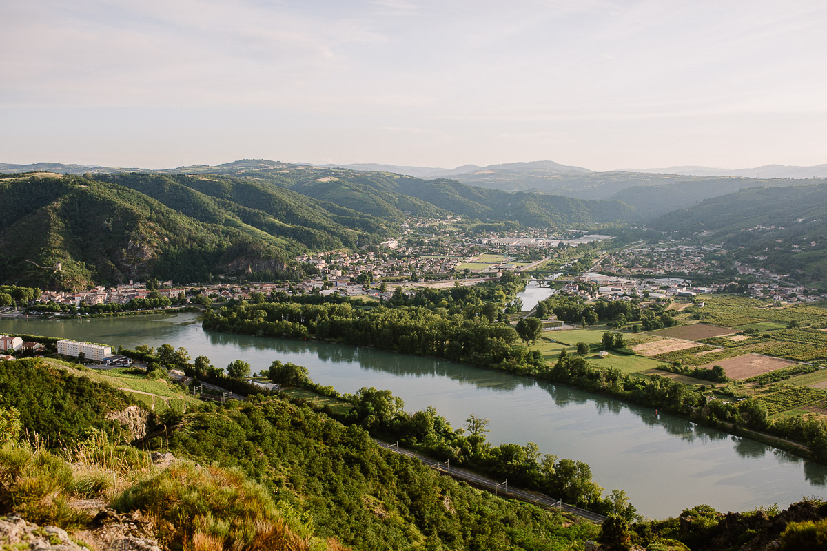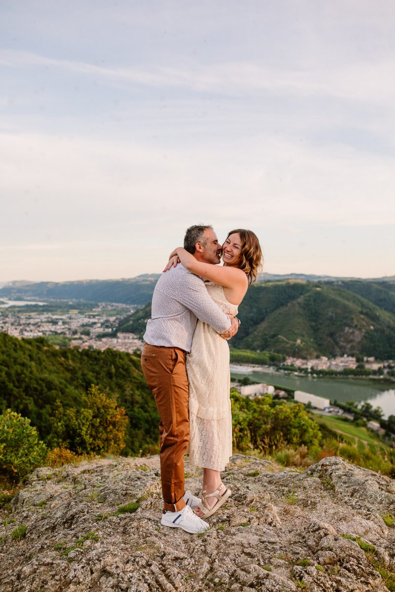 Avec ces deux amoureux, nous nous sommes donc donné rendez-vous entre Drôme et Ardèche, dans un très beau site naturel dominant le Rhône et les vignobles de l’Hermitage. La météo nous a gâtés, avec une très belle lumière dorée juste avant le coucher du soleil !