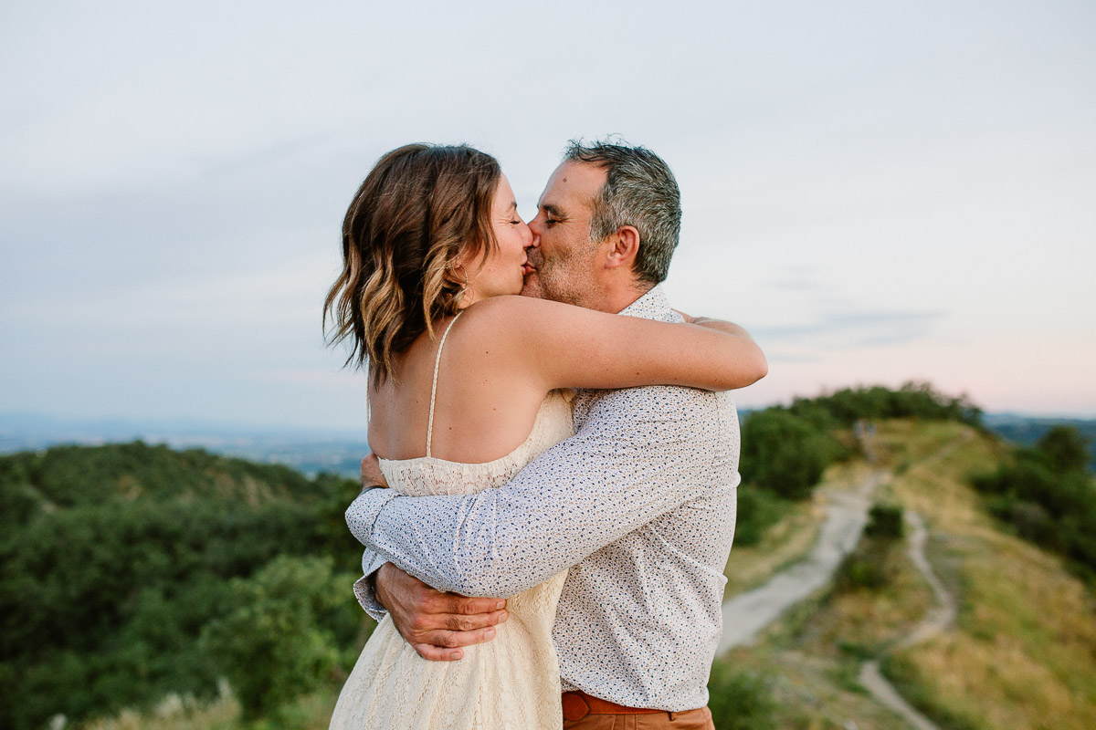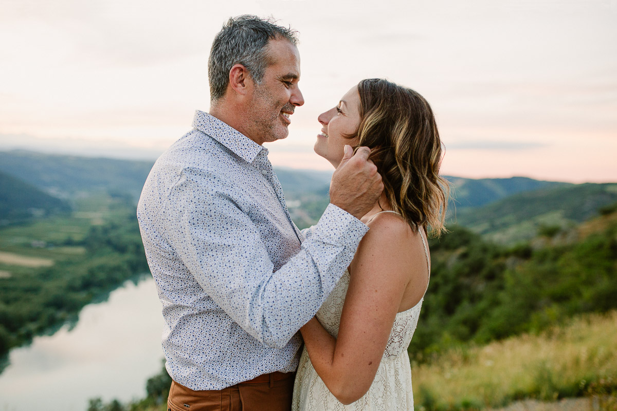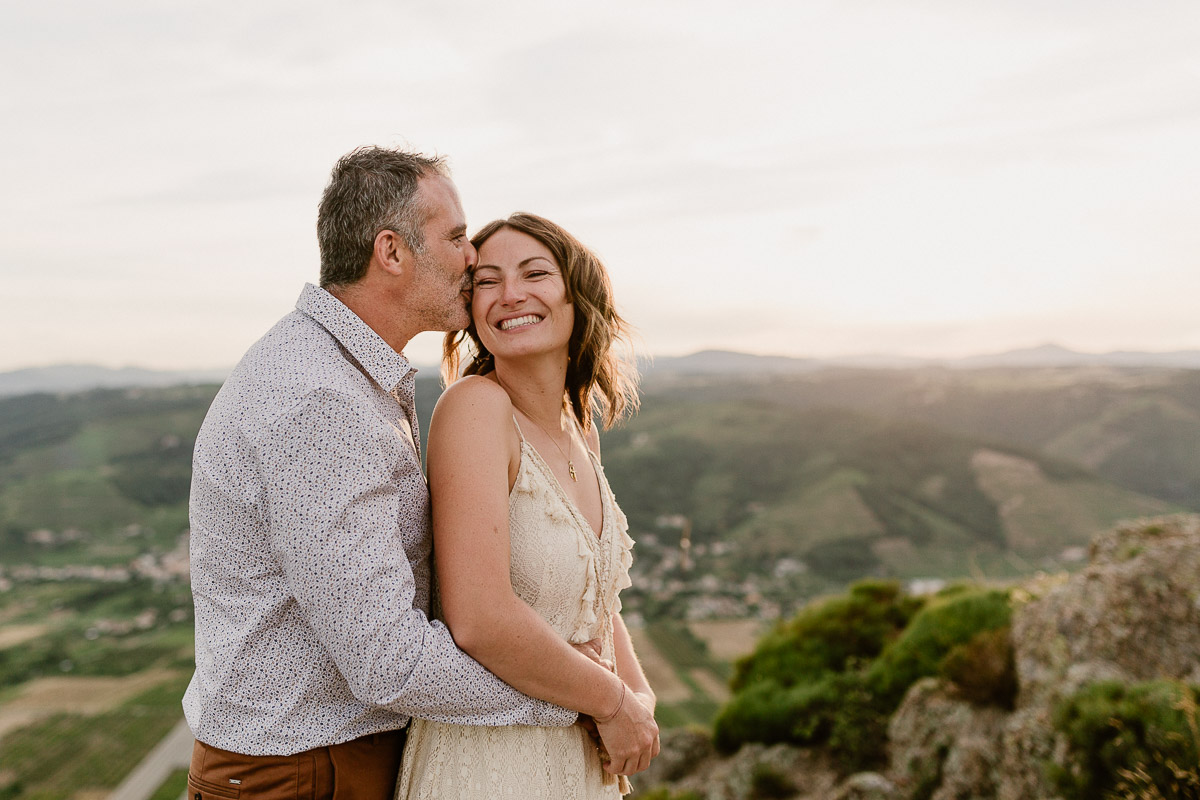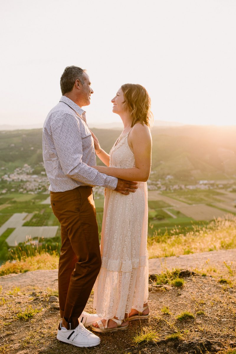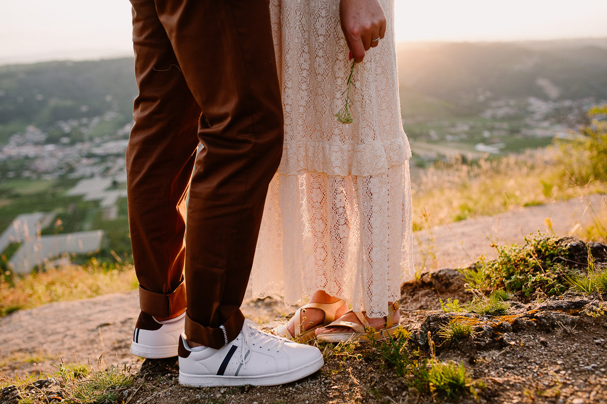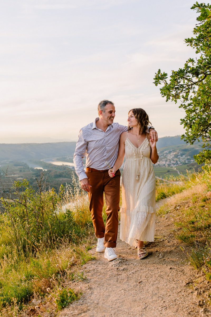 Avec ces deux amoureux, nous nous sommes donc donné rendez-vous entre Drôme et Ardèche, dans un très beau site naturel dominant le Rhône et les vignobles de l’Hermitage. La météo nous a gâtés, avec une très belle lumière dorée juste avant le coucher du soleil !