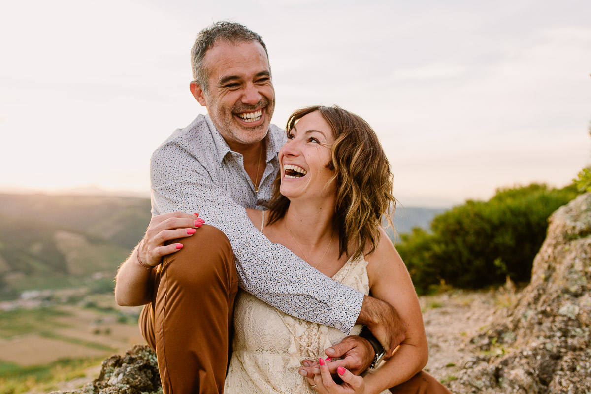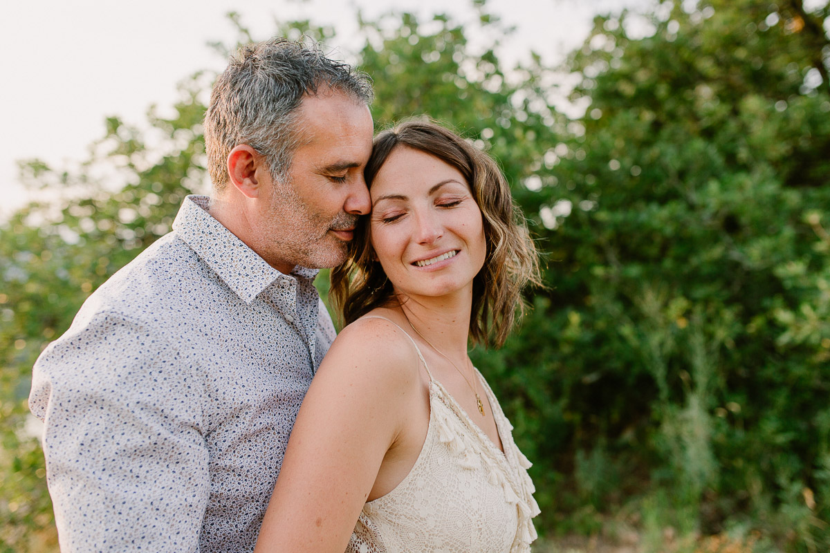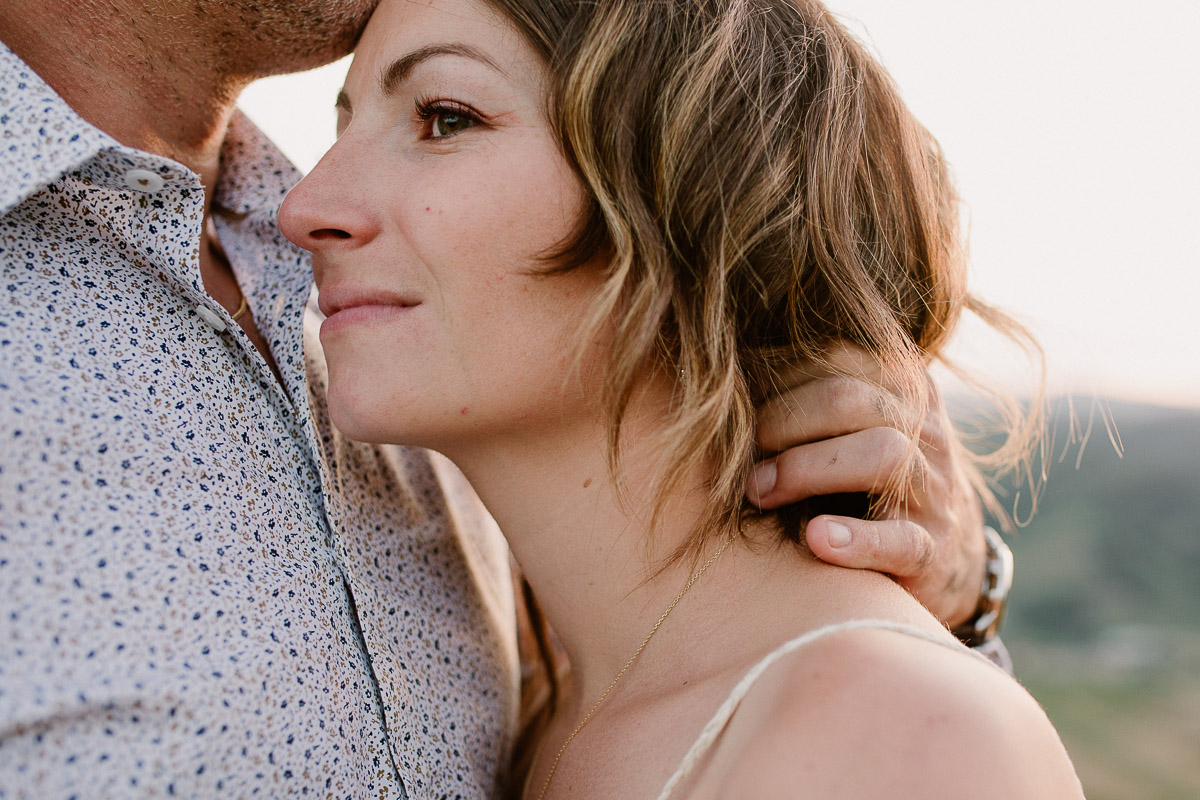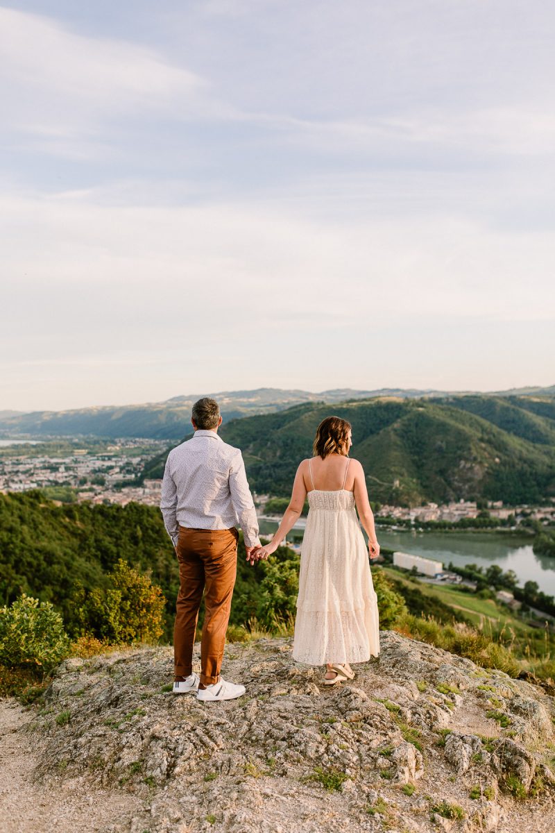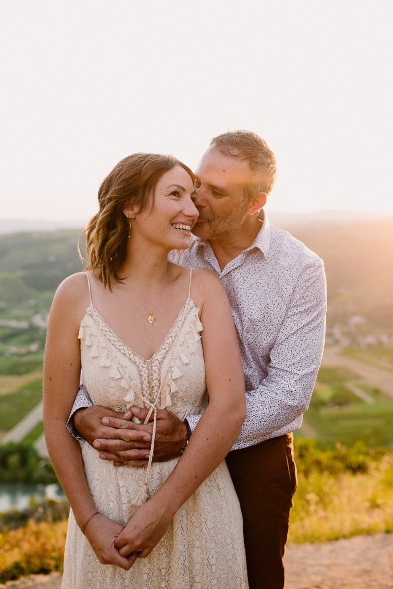 Avec ces deux amoureux, nous nous sommes donc donné rendez-vous entre Drôme et Ardèche, dans un très beau site naturel dominant le Rhône et les vignobles de l’Hermitage. La météo nous a gâtés, avec une très belle lumière dorée juste avant le coucher du soleil !